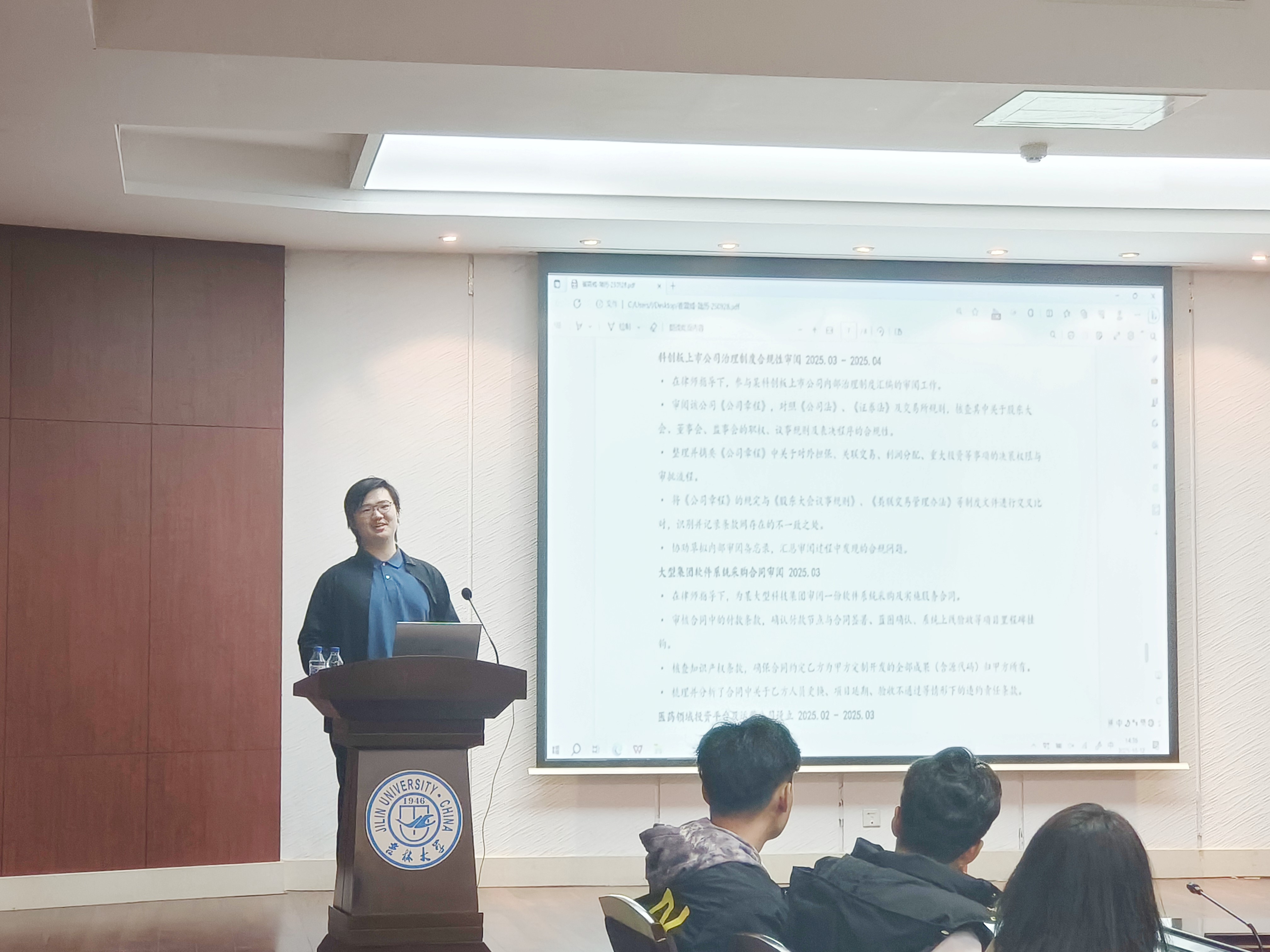 报告伊始,马捷副院长为大家介绍王勇老师,并代表学院对王老师的到来表示热烈的欢迎。随后,王勇老师结合个人职业发展历程,围绕大学求学、公务员、律师及教育创业者四个阶段展开分享,系统阐述了在商法融合背景下的实践思考与成长感悟。他从工作与学习双重视角出发,为在场同学们提出以下核心建议:在专业学习上,应拓宽知识边界,注重培养自学能力与主动担当的精神;在学习方法上,王老师将学习概括为十字经验,即“读书、思考、交流、实践、自学”,强调学习应超越应试,实现内化于心、外化于行;在职业规划上,王老师倡导“将个人内驱力与社会普遍需求相结合”,理性选择行业赛道,应不断向内探索,明晰真实需求,以内在动力驱动行为选择,持续学习与思考;在人生决策上,应以未来期望为导向,避免陷入线性思维的陷阱;在认知构建上,王老师强调个人认知的突破有赖于持续且主动的自我训练,学生应有意识地与高认知人士交流、刻意练习写作能力,在思想碰撞中汲取智慧,通过系统性的文字输出梳理思想。