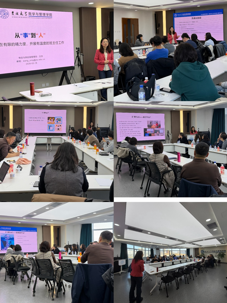 为深入落实开展树立和践行正确政绩观学习教育相关要求,全面落实立德树人根本任务,牢牢把握为党育人、为国育才初心使命,切实加强本科生班主任队伍建设,充分发挥班主任作为大学生思想政治教育骨干力量、学生健康成长引路人与守护者的重要作用,凝聚育人合力、提升育人实效,助力学生德智体美劳全面发展,2026年3月18日,吉林大学商学与管理学院在东荣大厦A506会议室成功举办了第一期班主任工作经验分享讲座与交流沙龙系列活动。学院特别邀请物流与供应链管理系的王杏老师作为分享嘉宾,与技术经济系、工程管理系、信息管理系和市场营销系的各系主任、书记、教学主任、现任班主任以及2026级拟聘班主任等30余人进行现场交流,活动由教学副院长马捷主持。