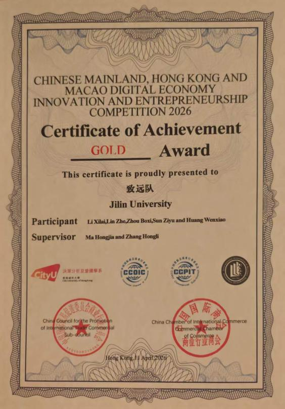本次竞赛跨度历时半年,历经知识赛、全国预选赛、书面评审及大陆区域总决赛的层层选拔,最终进入路演答辩的决赛环节。决赛聚焦“数字经济创新创业方案陈述”与“专家问询答辩”两大核心模块,全方位考量参赛团队。在备赛阶段,致远工作室展现了极高的专业造诣与创新驱动力。团队成员通过对数字经济赛道的深度穿透,系统完成了市场洞察、数据采集、财务建模、环境扫描及盈利模式论证等全链条研究。在决赛现场,面对评委专家的深度追问,团队成员凭借扎实的专业功底与默契的团队协作,做出了逻辑严密、论证充分的即时应答,充分彰显了吉大学子卓越的创新创业素养,最终在强手如林的竞技中脱颖而出,摘得佳绩。