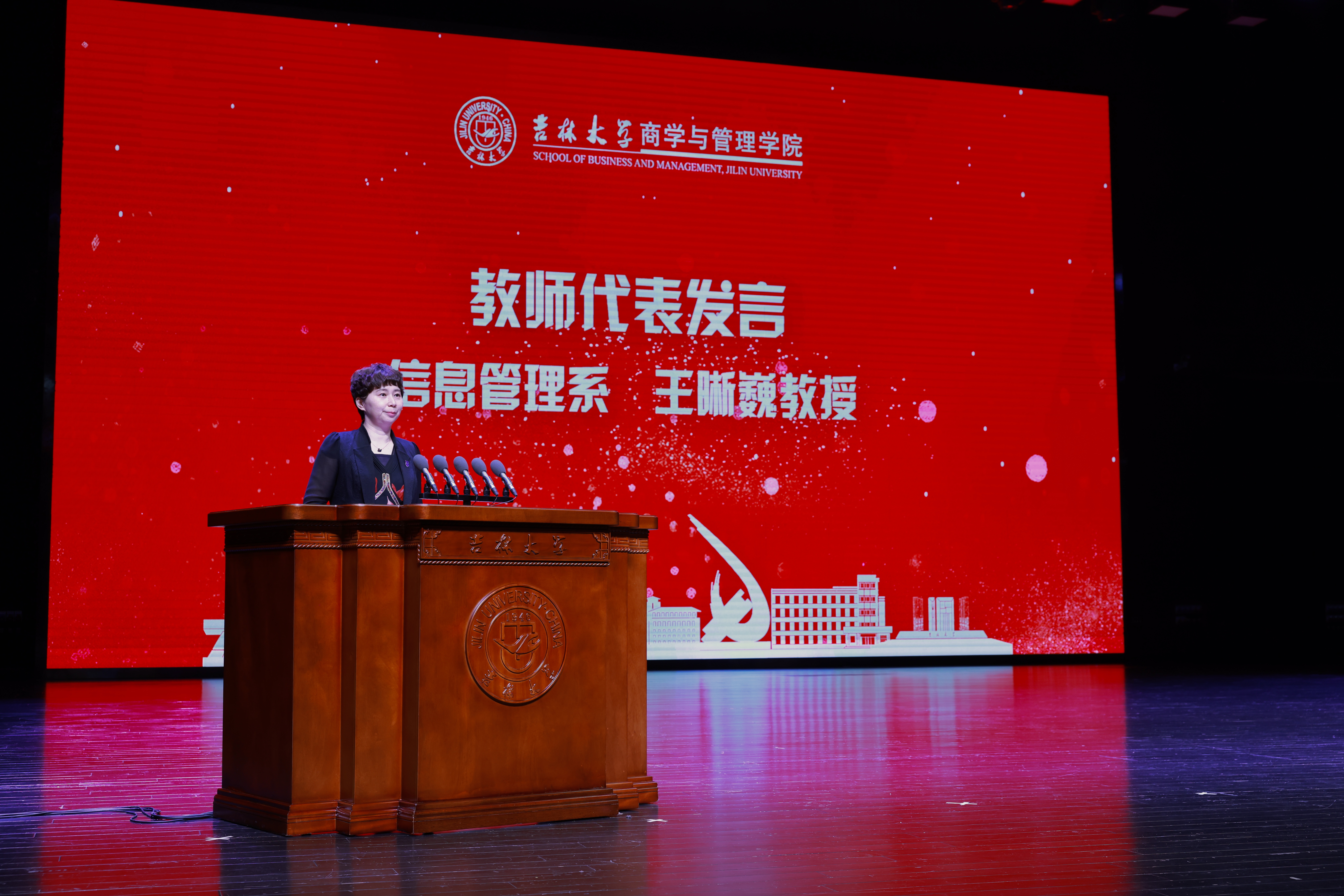 典礼上,吉林大学社会科学研究院副院长、青年长江学者、商学与管理学院信息管理系王晰巍教授,作为教师代表进行了发言。王晰巍教授在发言中对毕业生们送上祝福:第一,希望同学们心有梦想,能勇立时代潮头。第二,希望同学们追求优秀,把勤奋作为习惯。第三,希望同学们终身学习,提升人生格局。最后,王晰巍教授祝愿吉大商管的学子们能够不断开创个人职业生涯发展的灿烂前程,不断为吉大商管学院争光,不断谱写国家发展和时代腾飞的辉煌篇章!