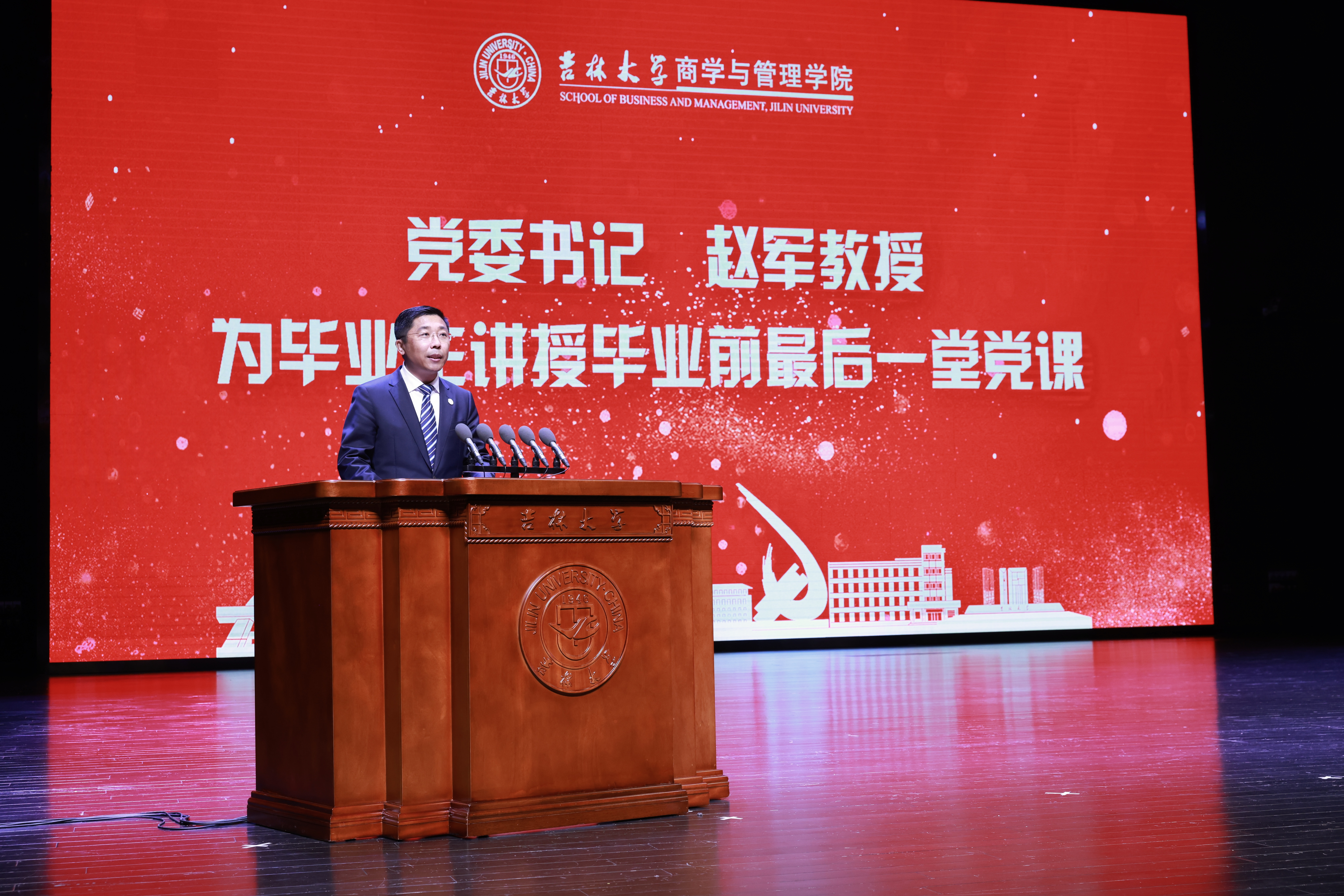 典礼上,商学与管理学院党委书记赵军教授为全体毕业生讲授了毕业前最后一堂党课。他提出要以红色基因永续青春年华,未来之日少年必有可为。他强调要用实际行动践行“请党放心、强国有我”的青春誓言,坚定不移听党话、跟党走。