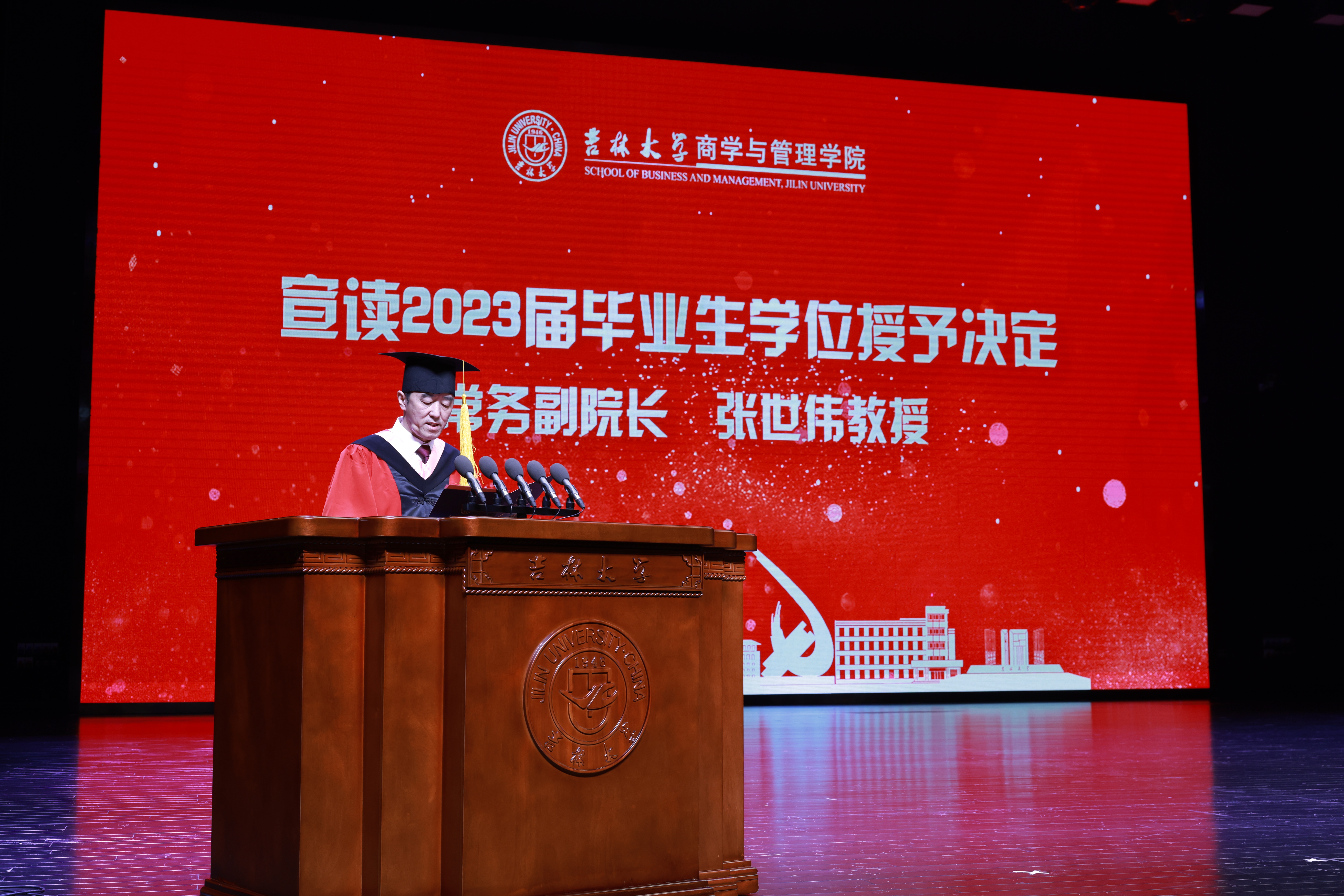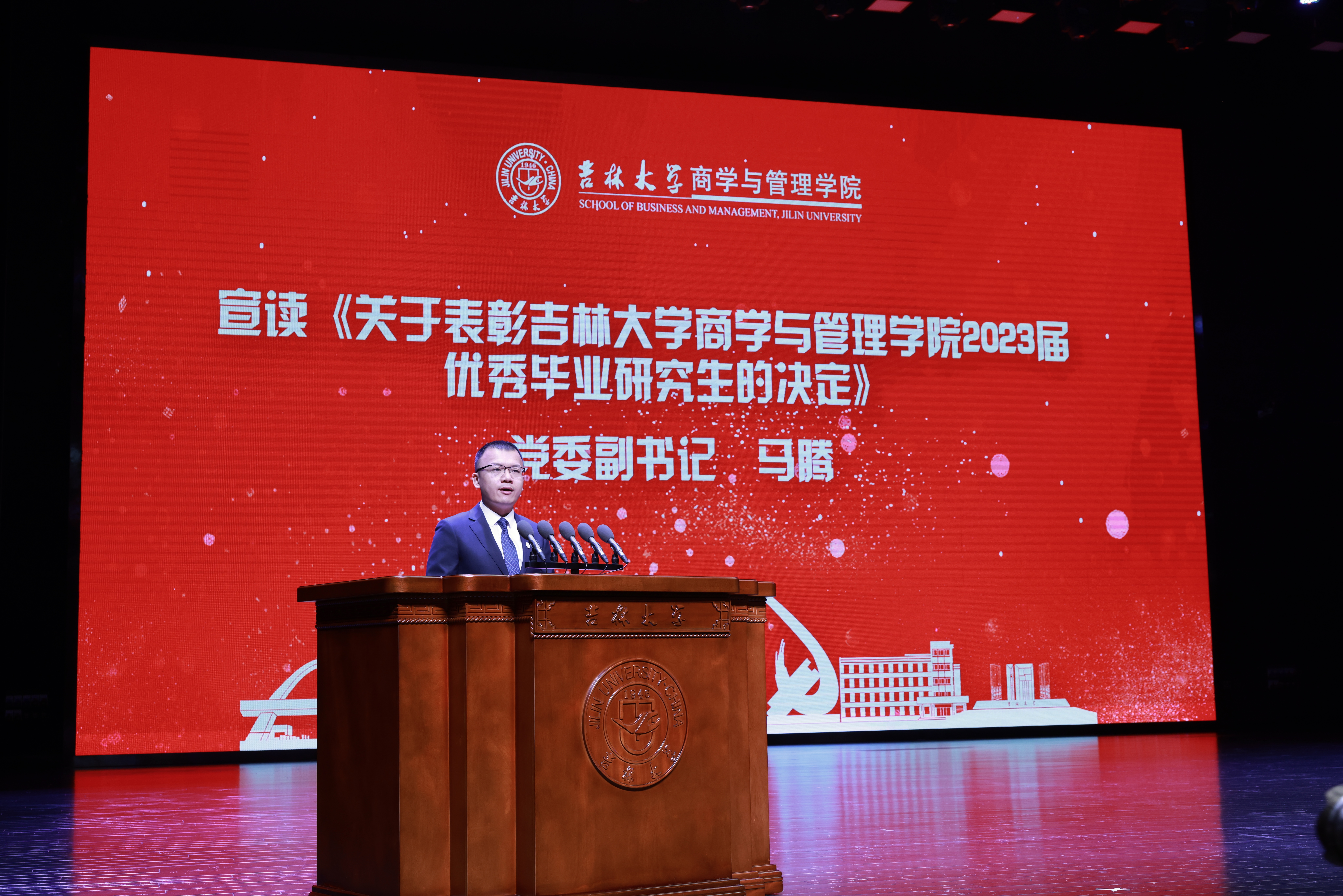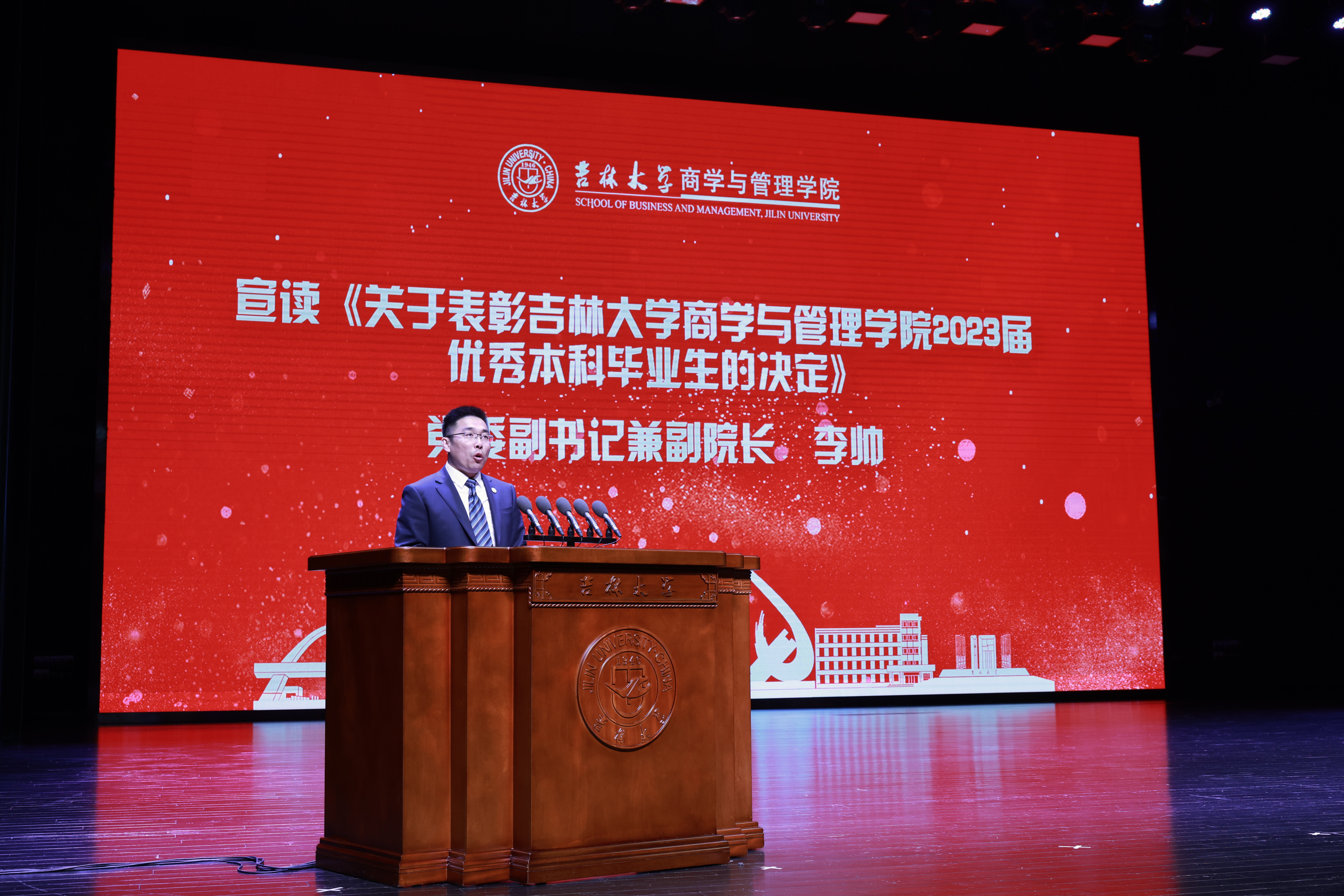 典礼上,商学与管理学院党委副书记兼副院长李帅老师、商学与管理学院党委副书记马腾老师分别宣读了《关于表彰吉林大学商学与管理学院2023届优秀本科毕业生的决定》和《关于表彰吉林大学商学与管理学院2023届优秀毕业研究生的决定》。