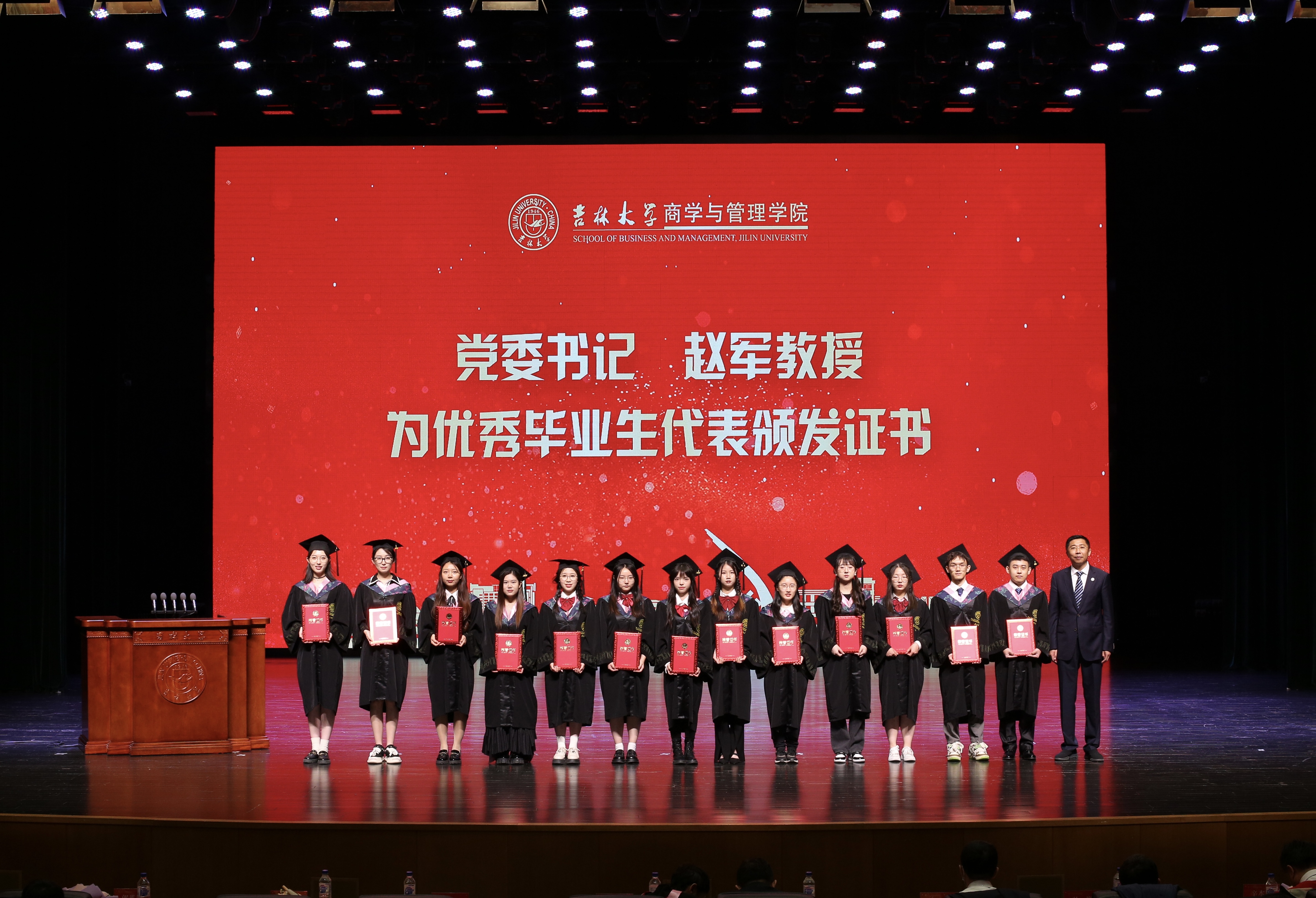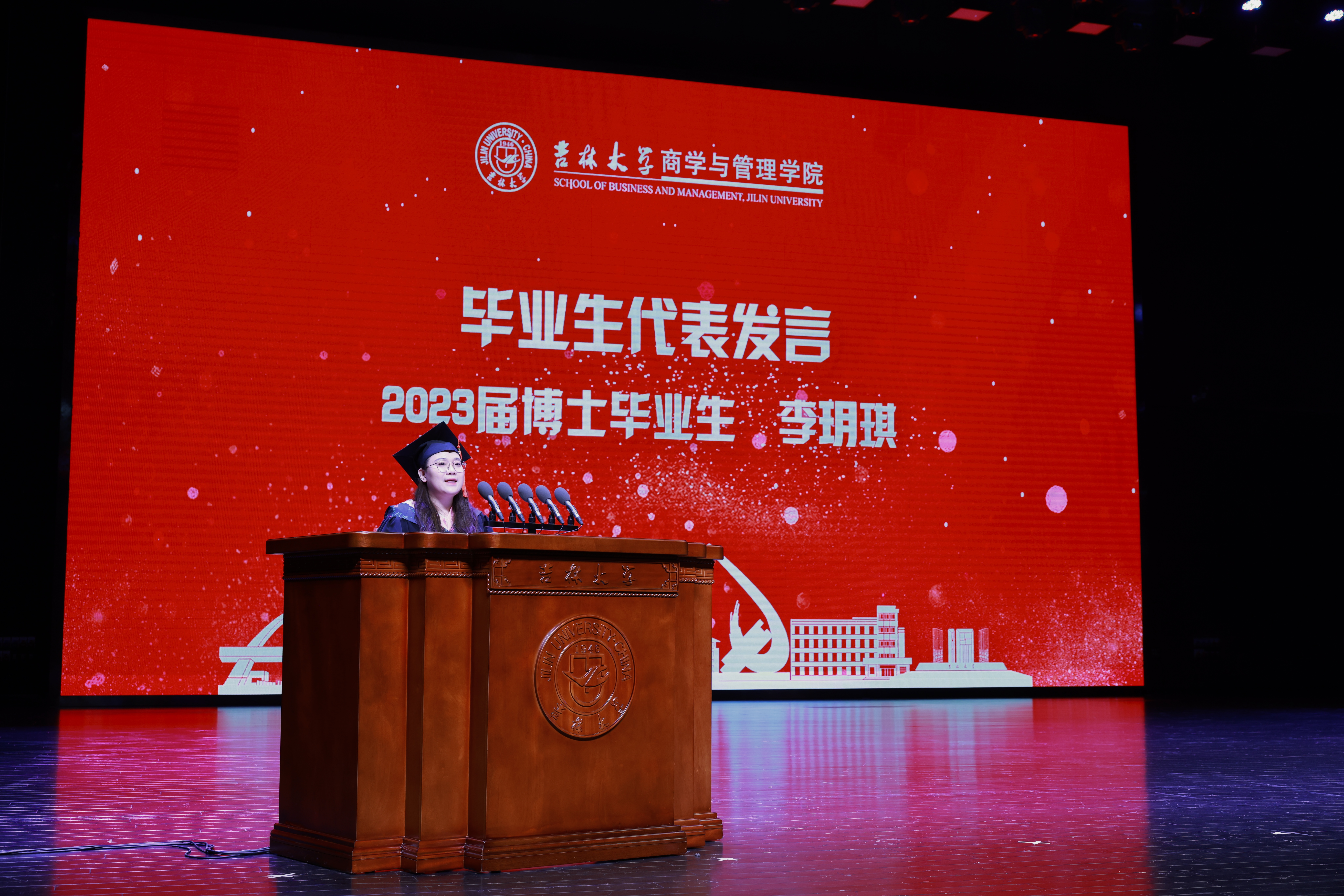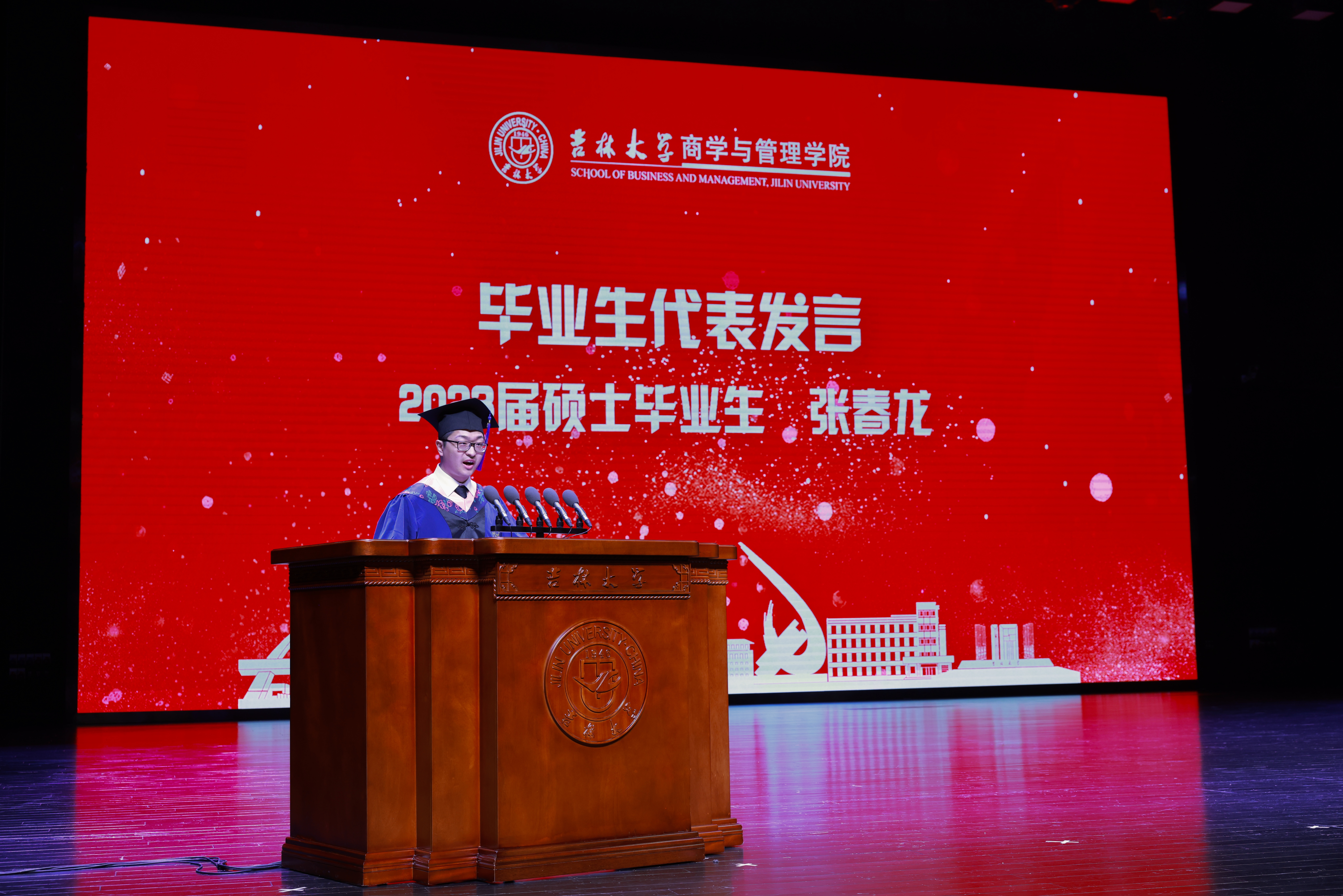 典礼上,商学与管理学院党委副书记兼副院长李帅老师、商学与管理学院党委副书记马腾老师分别宣读了《关于表彰吉林大学商学与管理学院2023届优秀本科毕业生的决定》和《关于表彰吉林大学商学与管理学院2023届优秀毕业研究生的决定》。