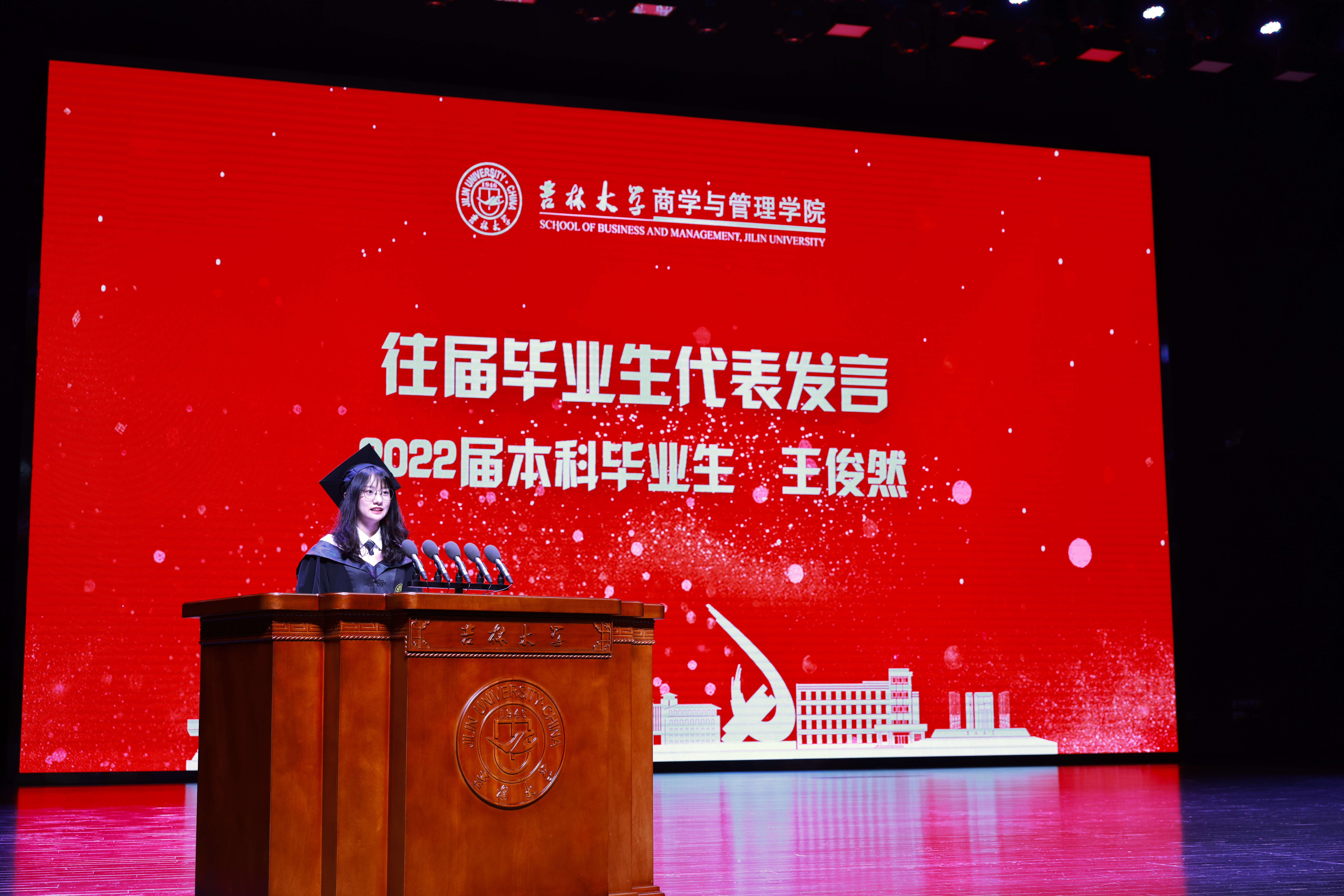 典礼上,往届毕业生代表、2022届财务管理本科毕业生王俊然进行了发言。王俊然同学回顾校园生活,深切表达了对母校的怀念与不舍,展望未来,她希望在以后的工作与生活中继续秉承吉大求实创新、励志图强的精神,砥砺前行。