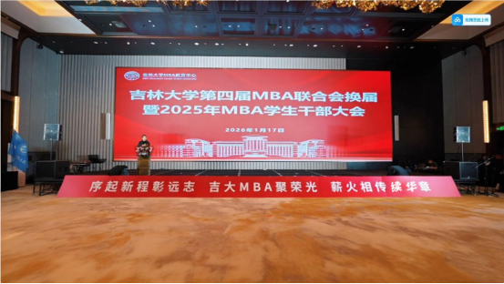 2026年1月17日,吉林大学第四届MBA联合会换届大会在洲际酒店顺利举行。吉林大学商学与管理学院党委书记赵军老师,研究生工作部部长兼研究生院副院长赵玥老师,商学与管理学院党委副书记李帅老师,商学与管理学院党委副书记兼副院长马腾老师,工商管理硕士(MBA)教育中心主任张公一老师,MBA教育中心副主任张越老师,MBA教育中心副主任印重老师莅临本次大会。会议由MBA教育中心学生事务工作办公室于琦老师主持。